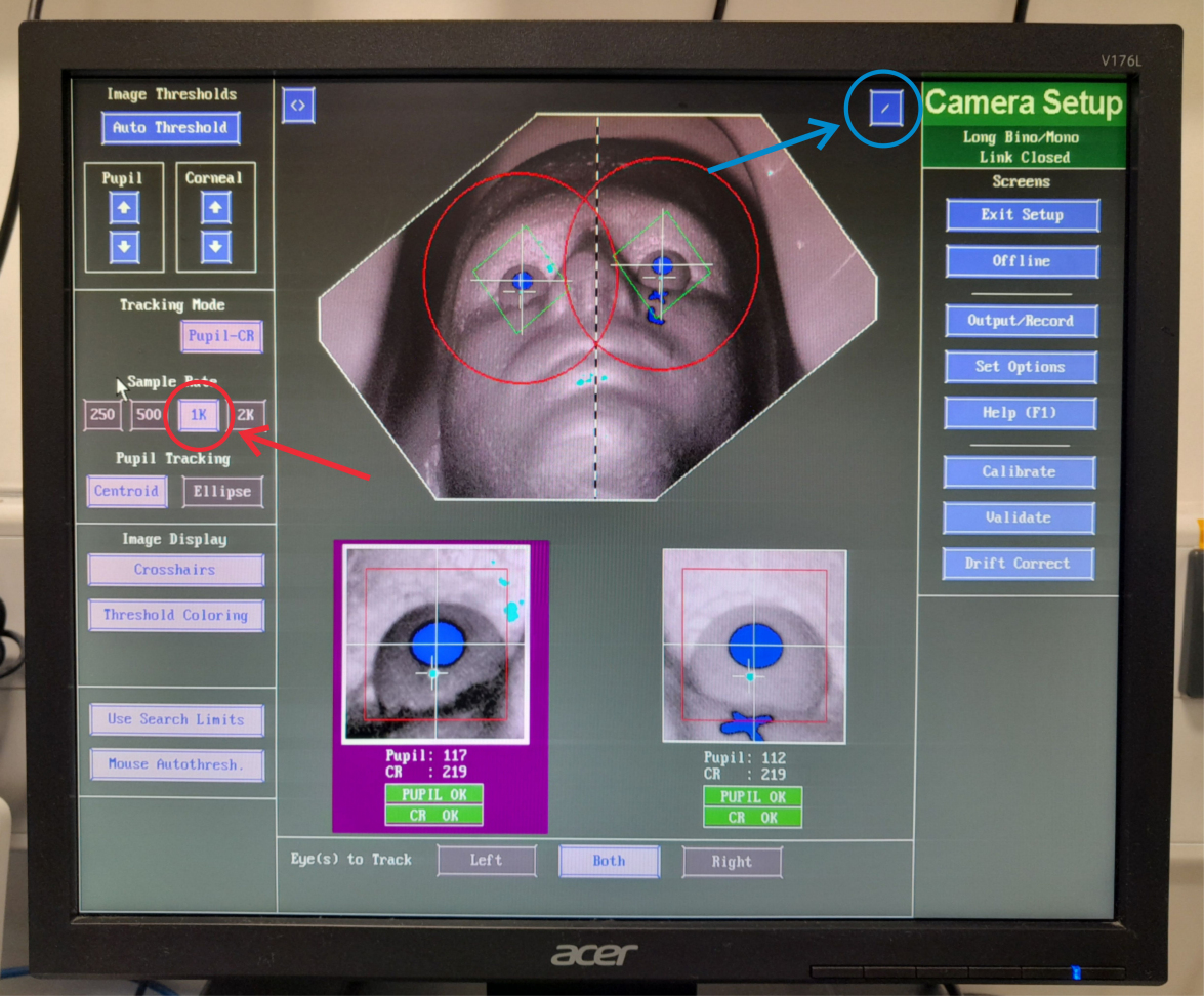 Correct detection: When both the pupil and CR are detected correctly, you will see the GREEN boxes, under the eye or eyes being tracked, showing PUPIL OK and CR OK in white text e.g. PUPIL OK