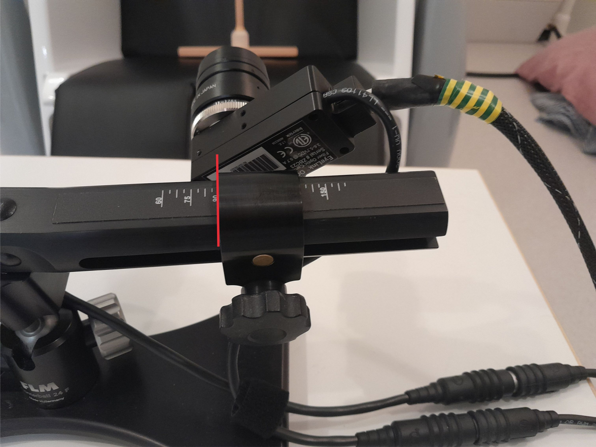 Adjust the camera and Illuminator clip positions on the mounting bar so that the inner edges align with the eye-to-camera distance measured in cm. - When using the small table, the separation should be already adjusted. Only if moving closer or further away will an adjustment need to be made.