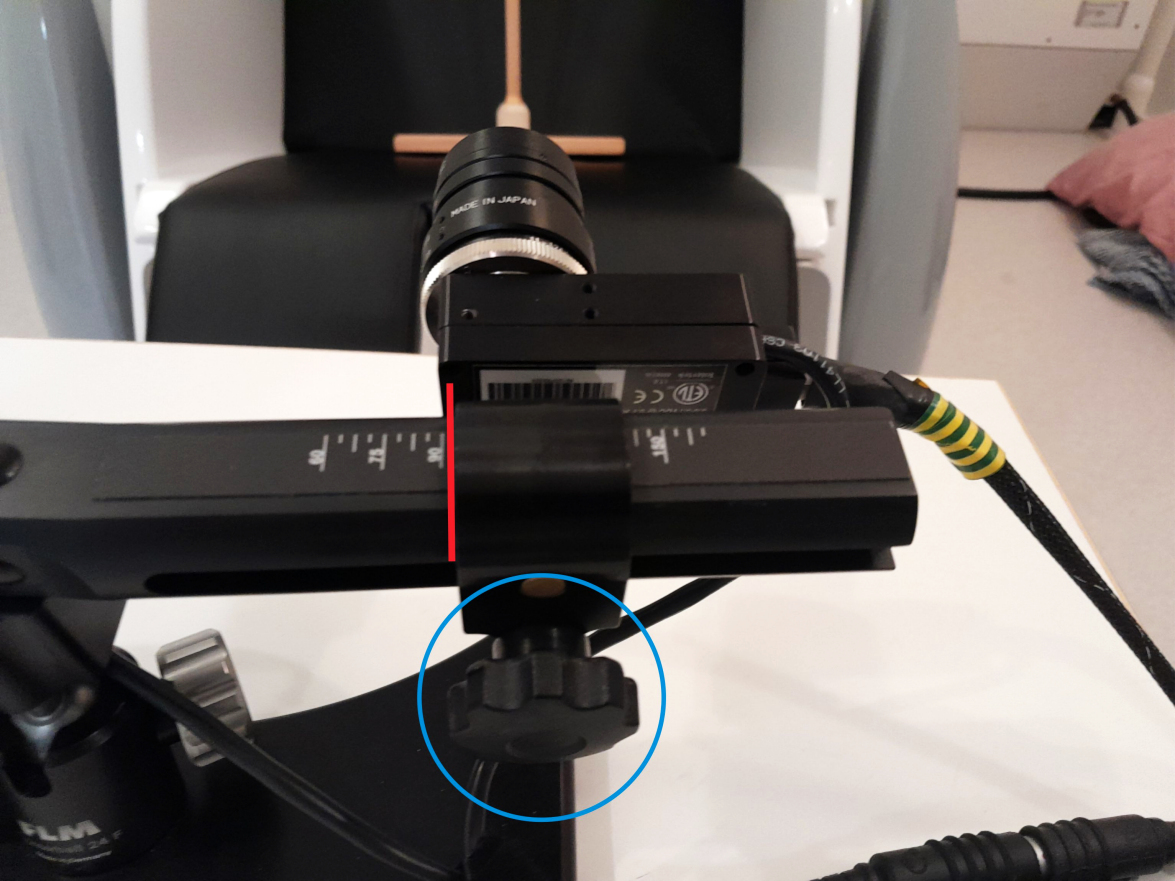 Once the Participant is positioned in the gantry chair, point/tilt the camera at the eye to be tracked so that the eye appears in the centre of the global view. (TOP IMAGE WINDOW on the Camera Setup screen), undoing/tightening the silver knurled knobs, remembering to keep the camera/IR illuminiator as level as possible.