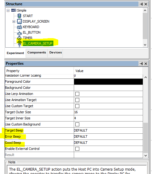 Some Participants reported the beeps are too loud through our Natus audio system.- If using Experiment Builder, click on the EL_CAMERA_SETUP node and turn the relevant properties from DEFAULT to OFF.