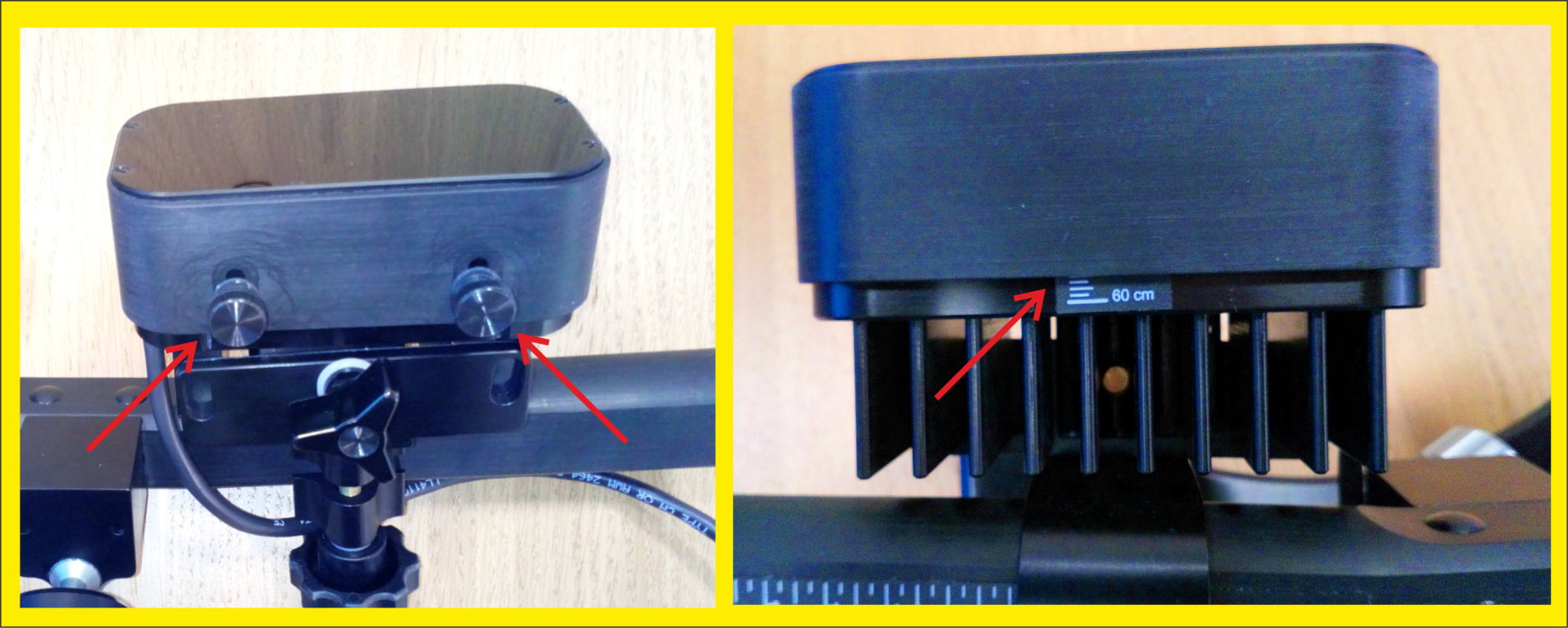 - If the the Illuminator needs focusing, loosen the two knurled knobs on the underside of the Illuminator and then adjust the cover so that its edge aligns with the marking that approximates the eye-to-camera distance and then tighten the knobs.