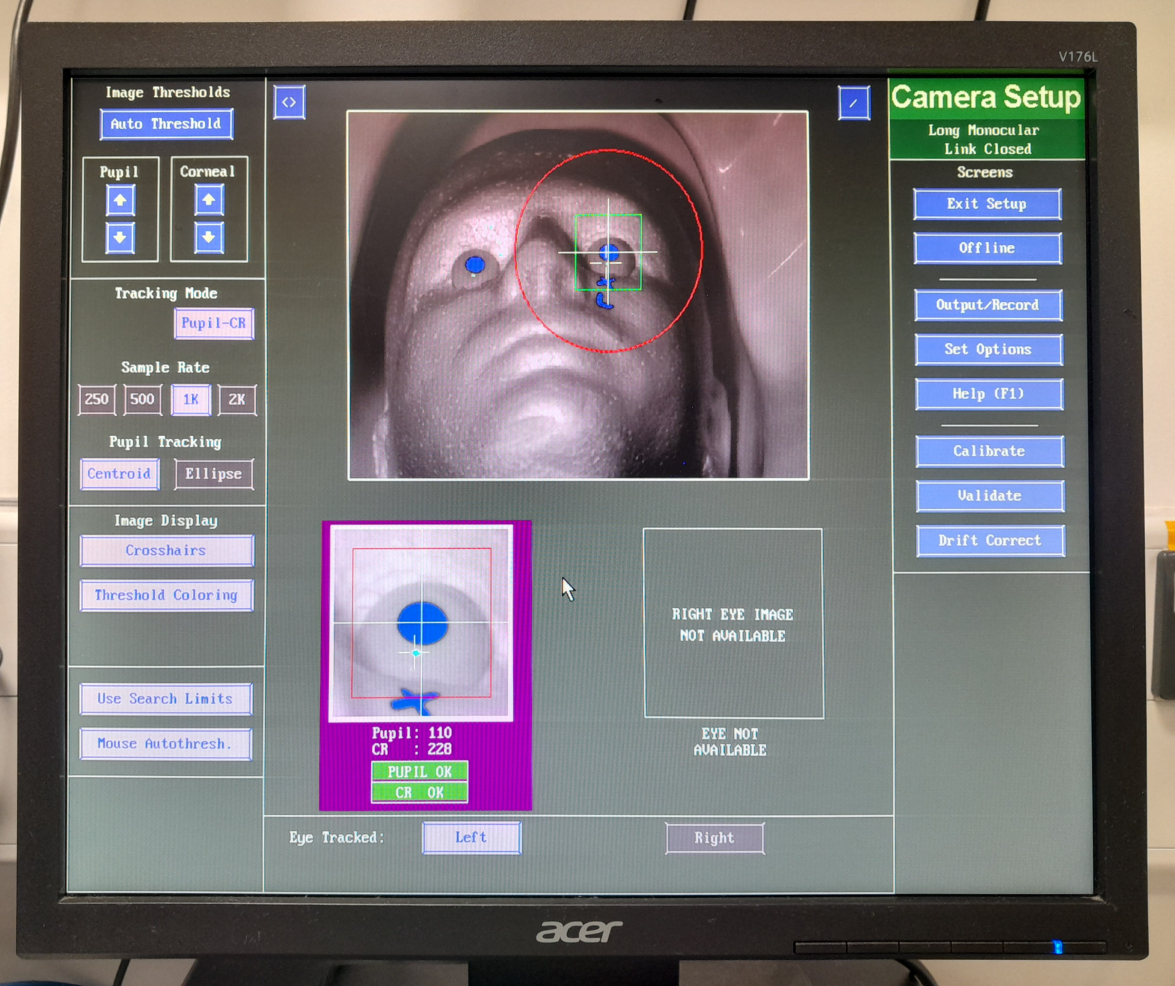 - Check which eye is being tracked in the EyeLink Host Computer! (the last known settings are used, which may be different to your own settings).